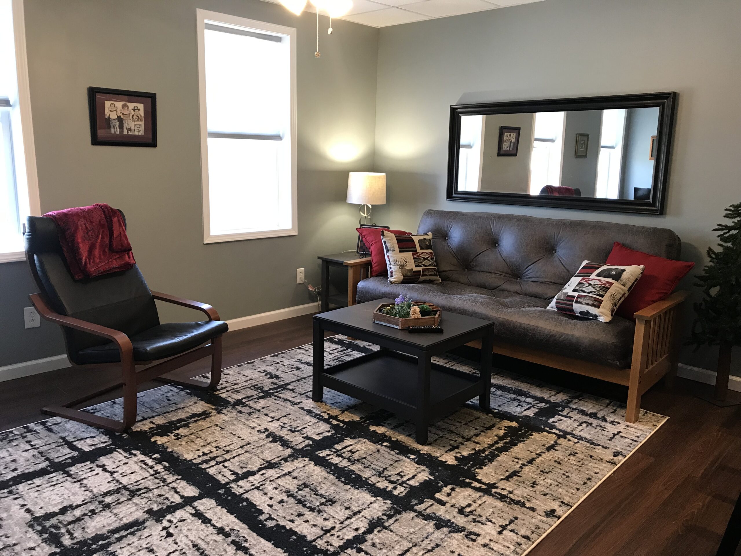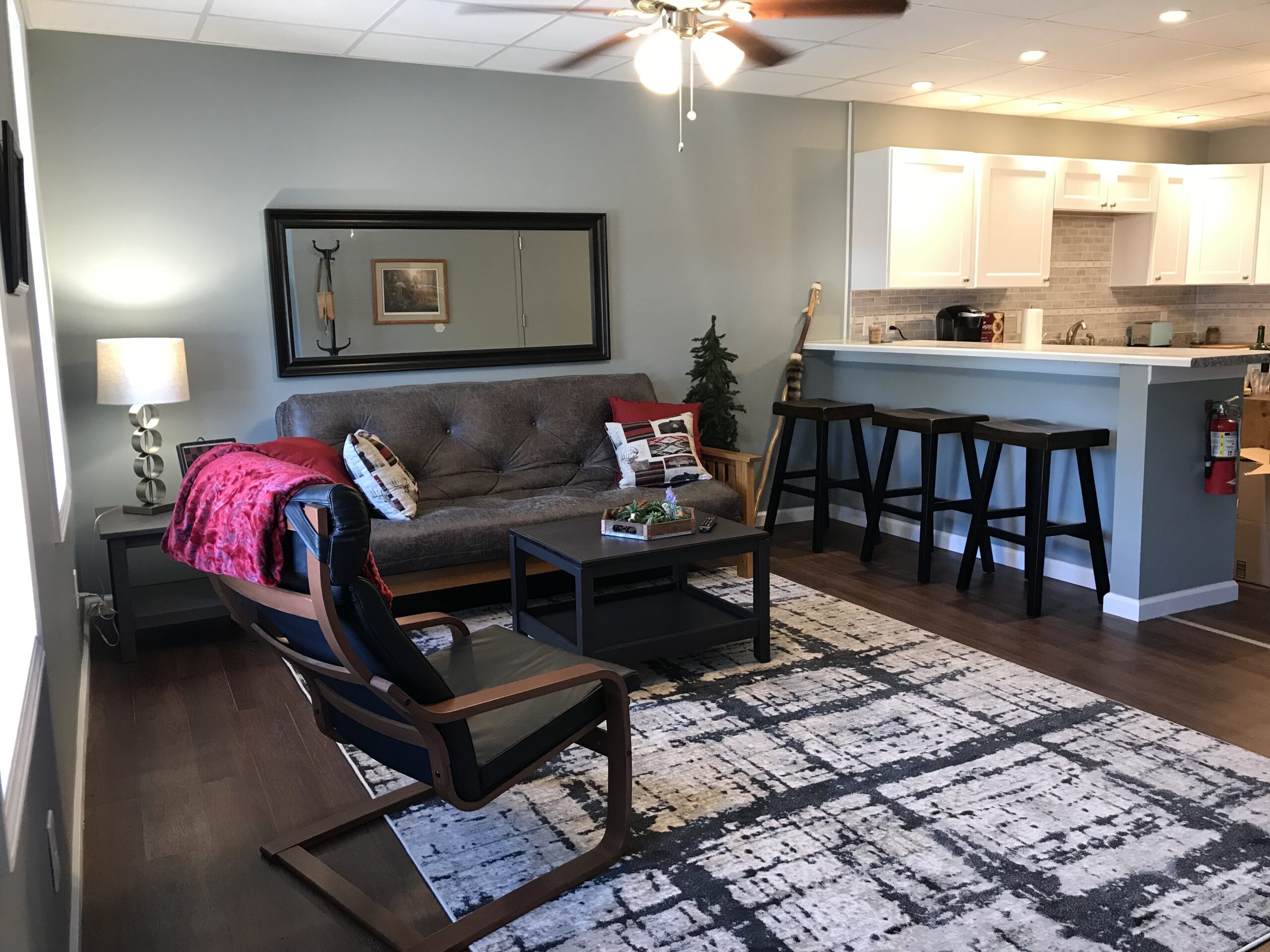 Suite 1 features a full kitchen, full bathroom, and two bedrooms each with a queen size bed as well as a convertible couch for additional sleeping capacity, and can accommodate up to five people.
